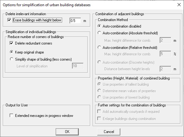 During the conversion process the building database can be simplified according to the selected options, see Figure 3. The simplification includes the erasing of buildings below a specific height, the reduction of the number of corners for each building individually (simplification of the building shape) and the combination of adjacent buildings. The same simplification process can also be applied for an already converted database by using the corresponding option from the Edit menu.