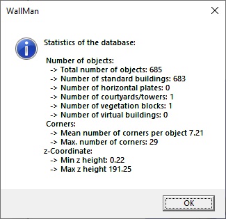 There are different file formats for the description of urban building databases. WallMan includes import modules for most of the common database formats. Besides the common formats, there are several company-specific file formats available, too.