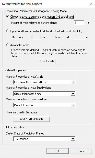 The consideration of the different material properties of the buildings/walls has a significant influence to the results of the wave propagation models. Therefore, for each object (building in urban databases and wall/subdivision in indoor databases), the corresponding material properties should be assigned.