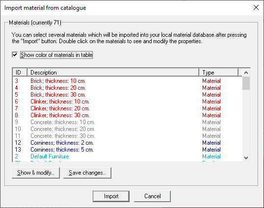 Material properties can be imported from other vector databases by using the button Import and can be exported to user-defined material catalogues with the button Export. Using the button Replace existing materials in the list can be replaced with material properties from another file.
